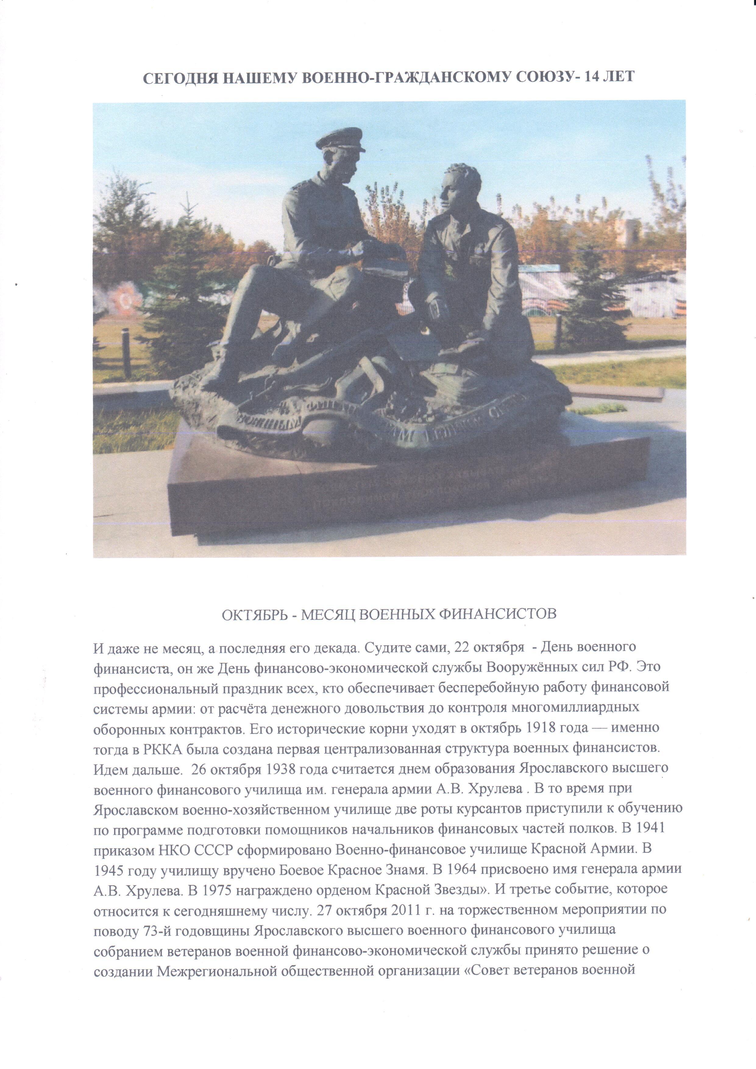 16 октября 2025 г. Указом Президента Российской Федерации от 15 октября 2025 года № 737 полковник О.В. Налимов назначен на воинскую должность начальника Главного управления военного бюджета Министерства обороны Российской Федераци, шдк «генерал-лейтенант». Совет ветеранов Военной финансово-экономической службы сердечно поздравляет Олега Владимировича и желает ему успехов в важнейшем деле стабильного и качественного финансового обеспечения Вооруженных Сил Российской Федерации путем создания реальных, действующих финансово-экономических органов по всей вертикали войск и сил армии и флота. Военные финанситы-ветераны готовы к сотрудничеству для выполнения соответствующих задач. 4 октября 2025 г. Совет ветеранов военой финансово-экономической службы совместно с Мэрией Ярославля начал работу по созданию скульптурной композиции «Курсант ЯВФУ на свидании с будущей невестой» в парке Юбилейный города Ярославля. Сегодня мы публикуем обращение руководства Совета ветеранов к выпускникам училища о сборе средств на создание данной скульптурной композиции. Первыми свои благотворительные взносы в сумме 10 тыс. руб. каждый перечислили на реализацию данного проекта члены правления Совета ветеранов – выпускники Ярославского военного финансового училища.