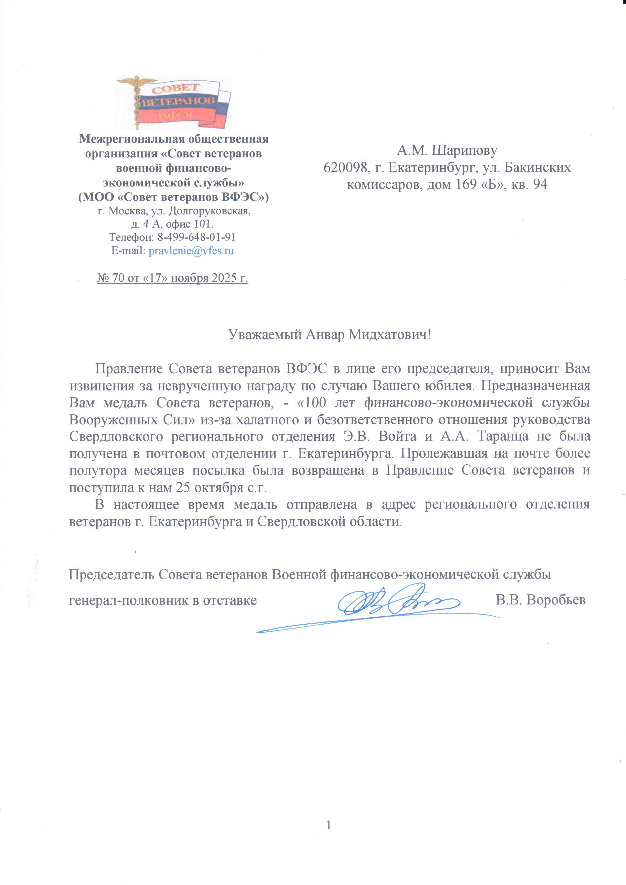 30 мая 2025 г. В газете «Красная звезда» за 29 мая 2025 г. опубликована статья, посвященная проведенному по инициативе Совета ветеранов ВФЭС открытию мемориальной доски одному из руководителей финансовой службы Сибирского военного округа, участнику Великой Отечественной войны подполковнику Петру Андреевичу Сарычеву. 15 мая 2025 г. Накануне Дня Великой Победы Совет ветеранов Военной финансово-экономической службы организовал комплекс мероприятий, посвященных 80-летию Победы Советского народа в Великой Отечественной войне. 6 мая 2025 года в Новосибирске Совет ветеранов Военной финансово-экономической службы открыл мемориальную доску участнику Великой Отечественной войны Сарычеву Петру Александровичу. На мероприятии присутствовали представители общественности Новосибирска, ветераны Великой Отечественной войны, участники локальных войн и военных конфликтов, ветераны военной службы Сибирского Военного округа, военнослужащие гарнизона, руководители военных и государственных структур, органов власти. С вступительным словом при открытии Доски выступил председатель Совета ветеранов ВФЭС генерал-полковник в отставке В.В. Воробьев.