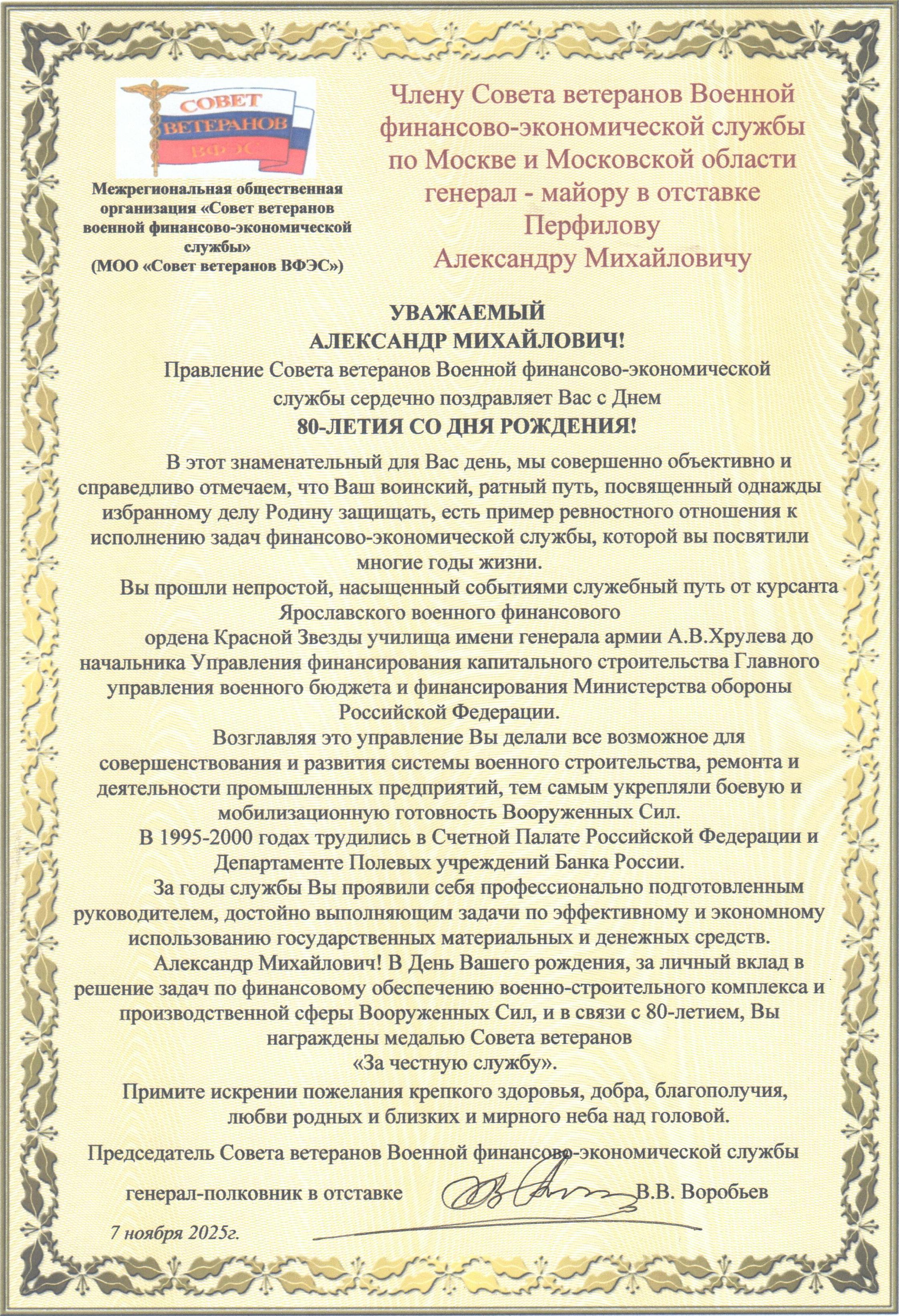 Сегодня, 7 ноября 2025 года, член регионального отделения Совета ветеранов Военной финансово-экономической службы по Новосибирской области старший прапорщик в отставке О.И. Воробьева празднует юбилей, ей исполняется 65 лет. Ольга Игоревна окончила в 1985 году Новосибирский институт народного хозяйства, а в 1989 году добровольно поступила на военную службу в Сибирский военный округ, где до декабря 2006 года служила в воинских частях на должностях тылового обеспечения. С 2006 года в течение 7 лет проходила службу в воинских частях этого же военного округа на должностях помощника командира по финансово-экономической работе отдельного батальона и заместителя начальника финансовой службы полка. После увольнения из Вооруженных сил в 2013 году она продолжила работу на финансовых должностях в ФКУ «Управление финансового обеспечения Министерства обороны РФ по Новосибирской области» 54 финансово-экономической службы МО РФ, где работает по настоящее время. Ее общий воинский и трудовой стаж составляет 36 лет. На всех должностях Ольга Игоревна добросовестно выполняла служебные обязанности, проявляла профессионализм, честность и трудолюбие. Приказываю: 1. 3а добросовестное исполнение воинских служебных и трудовых обязанностей и в связи с юбилеем – 65‑летием со дня рождения наградить старшего прапорщика в отставке О.И. Воробьеву медалью Совета ветеранов ВФЭС «За честную службу». 2. Желаю Вам, Ольга Игоревна, доброго здоровья на многие годы, бодрости духа, благополучия и успехов. Председатель Совета ветеранов военной финансово-экономической службы генерал-полковник в отставке В.В. Воробьев 4 ноября 2025 г.