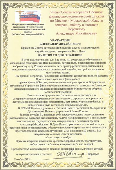Правление Совета ветеранов горячо поздравляет коллег с этим личным праздником, желает доброго здоровья, благополучия и удачи во всех делах на благо нашего Отечества. C уважением Председатель Совета ветеранов ВФЭС генерал-полковник в отставке В.В.Воробьев 31 октября 2025 г. Правление Совета ветеранов вместе с региональными отделениями на местах торжественно отметили профессиональный праздник – День финансово-экономической службы Вооруженных Сил, а также 87-летие со дня образования Ярославского военного училища. По сложившейся традиции в Ярославле по случаю этих исторических дат на Аллее Памяти состоялся митинг. На митинге выступил председатель Совета ветеранов Военной финансово-экономической службы по Ярославской области полковник запаса Тюрин Сергей Борисович, который рассказал о боевом пути нашего училища. Довел поздравление председателя Совета ВФЭС генерал-полковника В.В. Воробьева. Кроме того, Тюрин С.Б. в своем выступлении акцентировал внимание присутствующих на обращении Совета ветеранов по вопросу пожертвований для создания скульптурной композиции «Курсант ЯВВФУ на свидании с будущей невестой». В митинге приняли участие действующие офицеры, ветераны и студенты. Для всех собравшихся также было обращено внимание, что церковь Николы Мокрого является центром духовного возрождения ветеранской организации Военной финансово-экономической службы. После этого выступил настоятель церкви отец Василий который отметил, что длительное время, выполняя свои задачи в колыбели военных финансистов в г. Ярославле, училище внесло неоценимый вклад в дело подготовки офицерского состава финансовой специальности, которые своим ратным трудом показывали образцы служения Отечеству, укрепляя экономику Вооруженных сил и государства. Они по праву заслужили уважения за вклад в обеспечение боевой готовности армии и флота и социальную защиту людей в погонах. Он пожелал всем ветеранам финансовой службы крепкого здоровья, успехов и мирного неба. Торжественные мероприятия проведены Воронежским, Санкт-Петербургским филиалом и другими.
