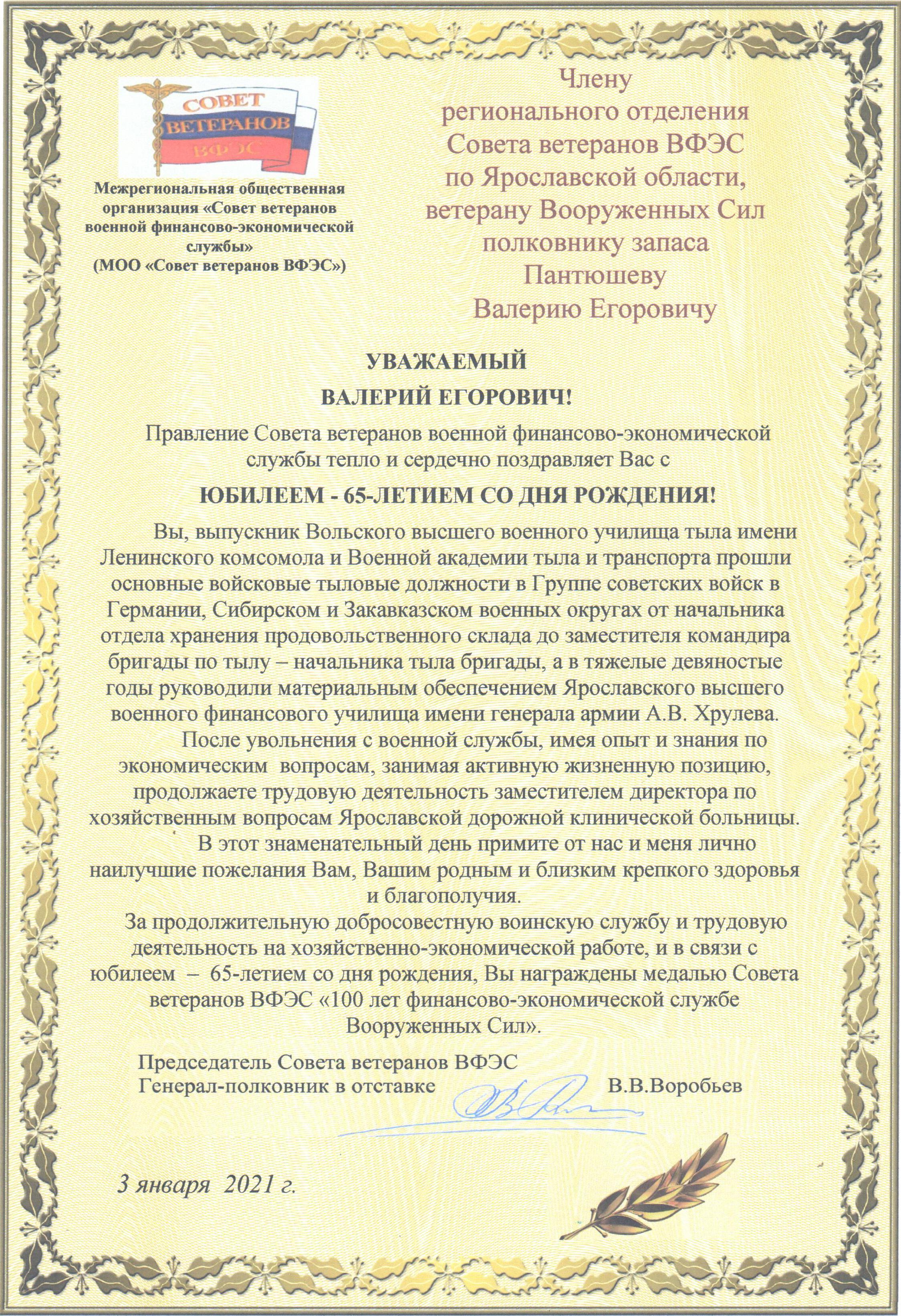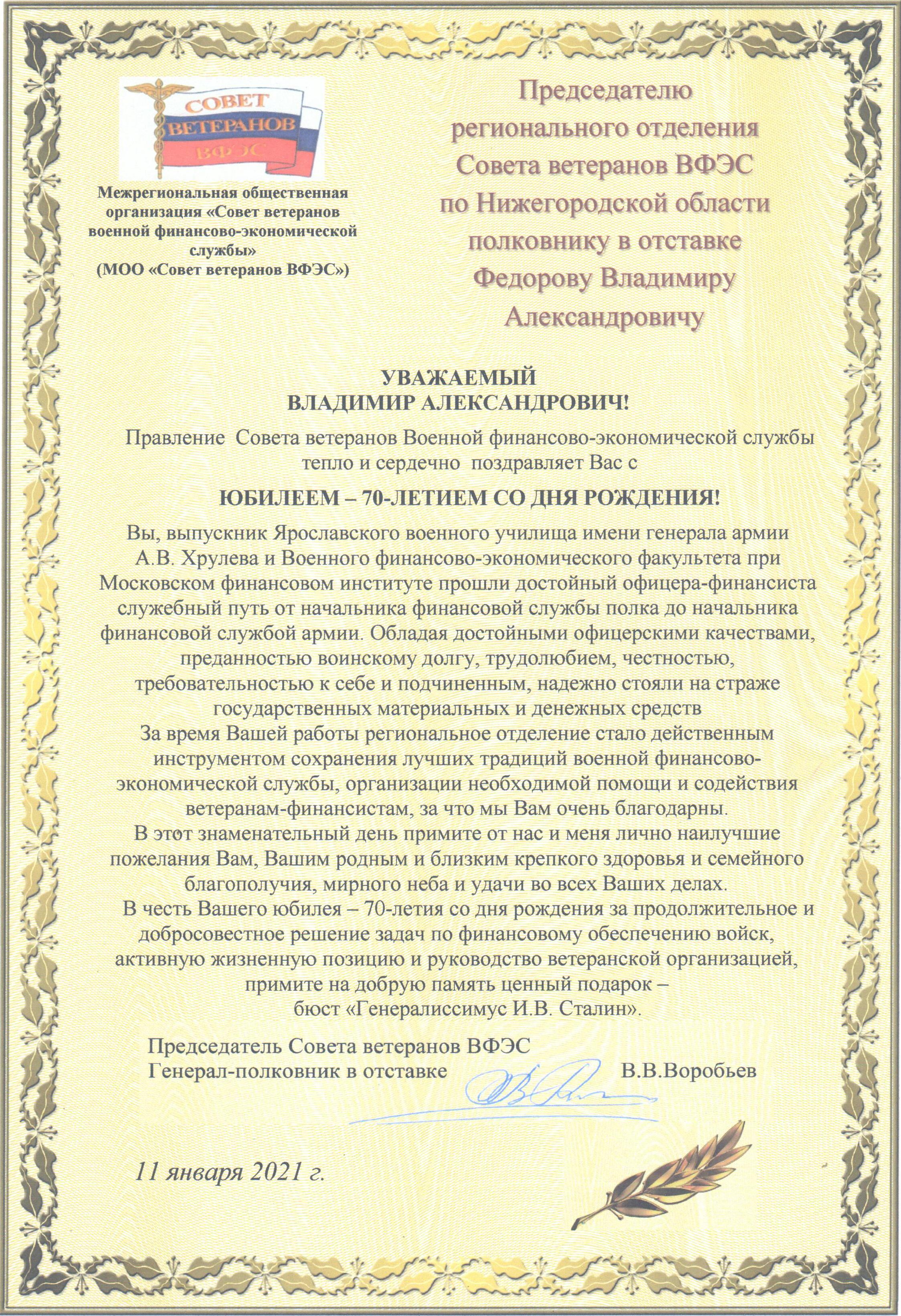 Сегодня, 27 июня 2021 года, член регионального отделения Совета ветеранов военной финансово-экономической службы по г. Санкт-Петербургу и Ленинградской области подполковник в отставке В.Г. Федоров празднует свой юбилей, ему исполняется 75 лет. Владимир Георгиевич в 1965 году поступил в Ленинградское артиллерийское училище, после окончания которого был направлен в Приволжский военный округ, где проходил службу командиром взвода, командиром батареи и начальником штаба – заместителем командира дивизиона артиллерийского полка. В последующем с 1976 года до 1985 года служил в Дальневосточном, Прибалтийском военных округах и Группе советских войск в Германии, также исполняя должность заместителя начальника штаба учебного артиллерийского полка. С 1986 года вновь в Прибалтийском военном округе проходил службу старшим помощником и начальником отделения Октябрьского районного военного комиссариата г. Риги. После увольнения в 1991 году с военной службы в течение 26 лет работал в отделе социального обеспечения при посольстве Российской Федерации в Латвии и Федеральном казенном учреждении «Управление финансового обеспечения Министерства обороны Российской Федерации по городу Санкт-Петербургу, Ленинградской области и Республике Карелия». Общий воинский и трудовой стаж В.Г. Федорова составляет 53 года. За период службы и работы Владимир Георгиевич на должностях социального работника Министерства обороны успешно и своевременно решал вопросы пенсионного обеспечения военнослужащих и членов их семей, осуществлял контроль за начислением и выплатой пенсий и социальных пособий, проявляя при этом принципиальность, честность профессионализм и трудолюбие. Он принимает активное участие в работе регионального отделения ветеранской организации. Приказываю: 1. 3а долголетнюю воинскую службу, качественное решение служебных и трудовых задач по пенсионному обеспечению военных пенсионеров и членов их семей и в связи с 75‑летием со дня рождения наградить подполковника в отставке В.Г. Федорова медалью Совета ветеранов ВФЭС «За честную службу». 2. Желаю Вам, Владимир Георгиевич, крепкого здоровья на многие годы, исполнения всего задуманного, бодрости духа, благополучия и удачи. Председатель Совета ветеранов военной финансово-экономической службы генерал-полковник в отставке В.В. Воробьев 27 июня 2021 г. Поздравление! 25 июня 2021 г. 22 июня, в День памяти и скорби – день начала Великой Отечественной войны, в общероссийской еженедельной газете «Военно-промышленный курьер» опубликована статья «Из одного металла льют», подготовленная членами Межрегиональной общественной организации «Совет ветеранов военной финансово-экономической службы» генерал-майором в отставке В.Г. Печугиным и полковником запаса И.В. Еней. Статья посвящена памяти генерала армии А.В. Хрулёва – создателя системы финансового и материального обеспечения Красной армии как в предвоенные годы, так и в годы Великой Отечественной войны. В ней раскрыты основные направления его ратного и трудового подвига как руководителя и организатора, решавшего сложнейшие вопросы в критическое для страны время и внесшего огромный личный вклад в Великую Победу Советского народа над фашистской Германией. Сегодня мы вновь напомнили власти, СМИ об их задачах, связанных с работой по освещению великих историч