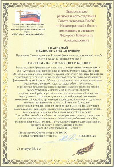 Правление Совета ветеранов горячо поздравляет коллег с этим личным праздником, желает доброго здоровья, благополучия и удачи во всех делах на благо нашего Отечества. C уважением Председатель Совета ветеранов ВФЭС генерал-полковник в отставке В.В.Воробьев 31 октября 2021 г.