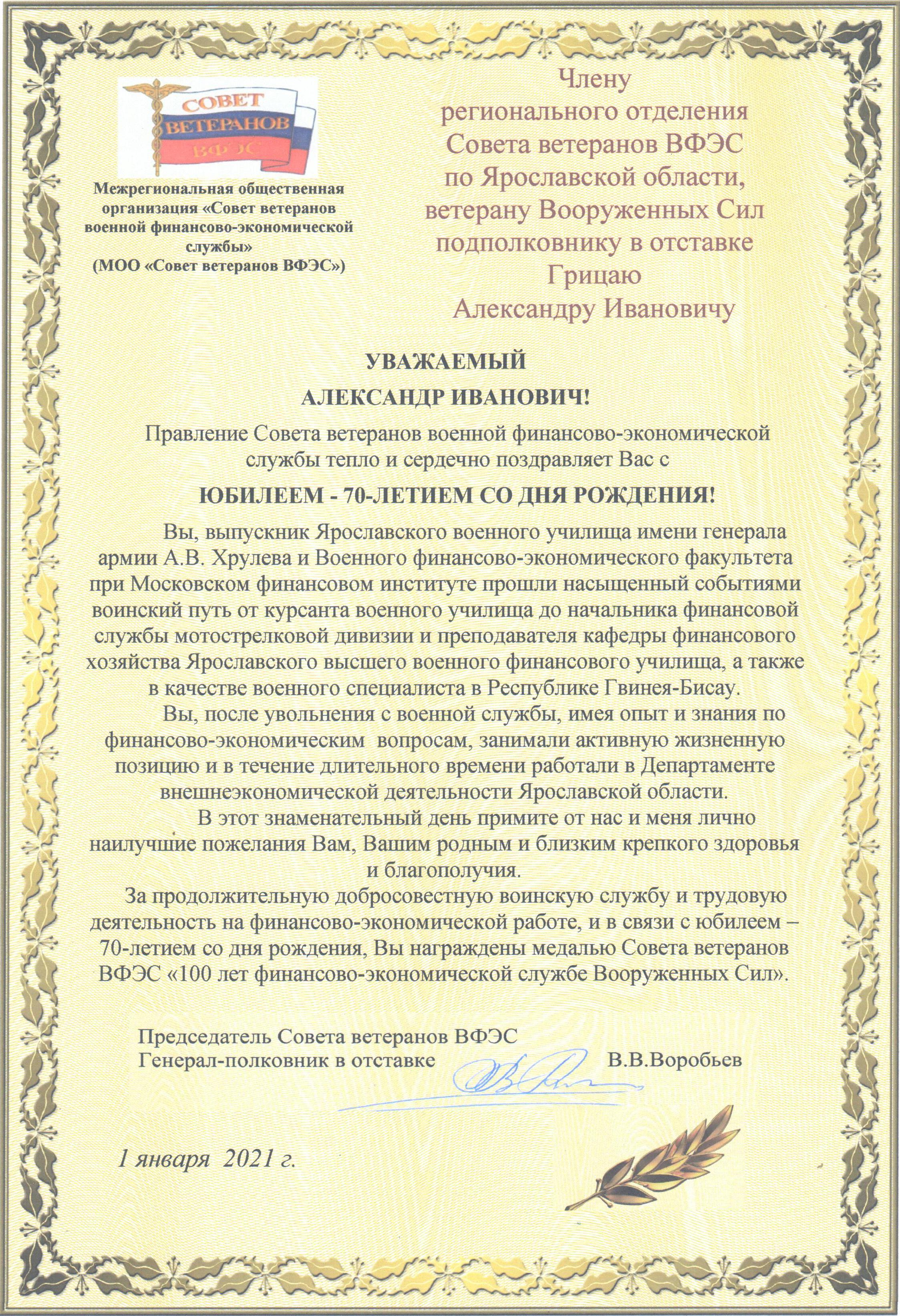 Сегодня, 30 июля 2021 года, член регионального отделения Совета ветеранов военной финансово-экономической службы по Ростовской области подполковник в отставке О.Д. Ивахненко празднует свой юбилей, ему исполняется 65 лет. Олег Дмитриевич в 1973 году поступил в Ярославское военное училище имени генерала армии А.В. Хрулева, после окончания которого в 1976 году был направлен в распоряжение Центрального финансового управления Министерства обороны и проходил службу в группах финансирования капитального строительства в различных регионах страны в должностях инспектора и старшего инспектора-ревизора, заместителя начальника и начальника группы. В период прохождения службы он в 1985 году окончил заочное отделение Военного финансово-экономического факультета при Московском финансовом институте. С 2006 года О.Д. Ивахненко являлся начальником территориального отдела финансирования капитального строительства объектов центрального подчинения. Уволен с военной службы в запас в 2010 году. Общий воинский стаж О.Д. Ивахненко в Вооруженных силах составляет 37 лет. За период военной службы Олег Дмитриевич добросовестно и с высокой ответственностью относился к делу финансирования и контроля в капитальном строительстве Министерства обороны, показывал примеры профессионализма, трудолюбия и честности, надежно стоял на страже государственных средств. Приказываю: 1. За продолжительное и добросовестное решение задач по финансовому обеспечению капитального строительства Министерства обороны и в связи с юбилеем – 65‑летием со дня рождения наградить подполковника в отставке О.Д. Ивахненко медалью Совета ветеранов ВФЭС «100 лет финансово-экономической службе Вооруженных сил». 2. Желаю Вам, Олег Дмитриевич, доброго здоровья и благополучия на многие годы, бодрости духа и удачи. Председатель Совета ветеранов военной финансово-экономической службы генерал-полковник в отставке В.В. Воробьев 25 июля 2021 г. Поздравление! 24 июля 2021 г. Поздравление! 15 июля 2021 г. Поздравление! 11 июля 2021 г. Поздравление! 11 июля 2021 г.