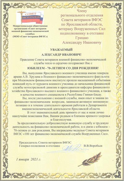 Сегодня, 5 июля 2021 года, член регионального отделения Совета ветеранов военной финансово-экономической службы по Черноморскому флоту полковник в отставке А.И. Крутов празднует свой юбилей, ему исполняется 65 лет. Александр Ильич в 1974 году был призван на действительную срочную военную службы в Среднеазиатский военный округ сапером-разведчиком инженерно-саперного батальона. В 1975 году он поступил в Ярославское высшее военное финансовое училище имени генерала армии А.В. Хрулева, после окончания которого в 1979 году был направлен на Тихоокеанский флот, где проходил службу главным бухгалтером УНР и старшим помощником начальника финансового отдела Дальневосточного военного строительного управления, а с 1987 года главным бухгалтером судоремонтного завода флота. С 1991 года служил на Черноморском флоте главным бухгалтером судоремонтного завода и начальником учетно-аналитического отдела – главным бухгалтером финансово-экономического управления флота, вплоть до увольнения с военной службы в 2013 году. Общий воинский стаж А.И. Крутова в Вооруженных силах составляет 39 календарных лет. За период военной службы Александр Ильич добросовестно и с высокой ответственностью относился к исполнению возложенных на него обязанностей, показывал примеры трудолюбия, честности и профессионализма, внес существенный вклад в осуществление перехода соединений и воинских частей Черноморского флота на бухгалтерский учет. Лично разработал более 20 учебных и методических пособий для начальников финансовых органов по переходу на стоимостной учет. Провел большую учебно-методическую работу с личным составом финансовой службы непосредственно в частях и на кораблях. Принимает активное участие в работе регионального отделения Совета ветеранов ВФЭС. Приказываю: 1. За долголетнее добросовестное отношение к исполнению служебных обязанностей, значительный вклад в развитие форм и методов финансового учета кораблей, воинских частей и соединений, обучение и переподготовку личного состава финансовой службы и в связи с 65‑летием со дня рождения наградить полковника в отставке А.И. Крутова медалью Совета ветеранов ВФЭС «За вклад в подготовку и воспитание кадров». 2. Желаю Вам, Александр Ильич, доброго здоровья и благополучия на многие годы, бодрости духа и удачи. Председатель Совета ветеранов военной финансово-экономической службы генерал-полковник в отставке В.В. Воробьев 4 июля 2021 г. Поздравление! 3 июля 2021 г.