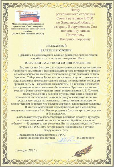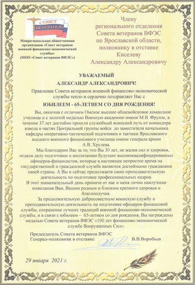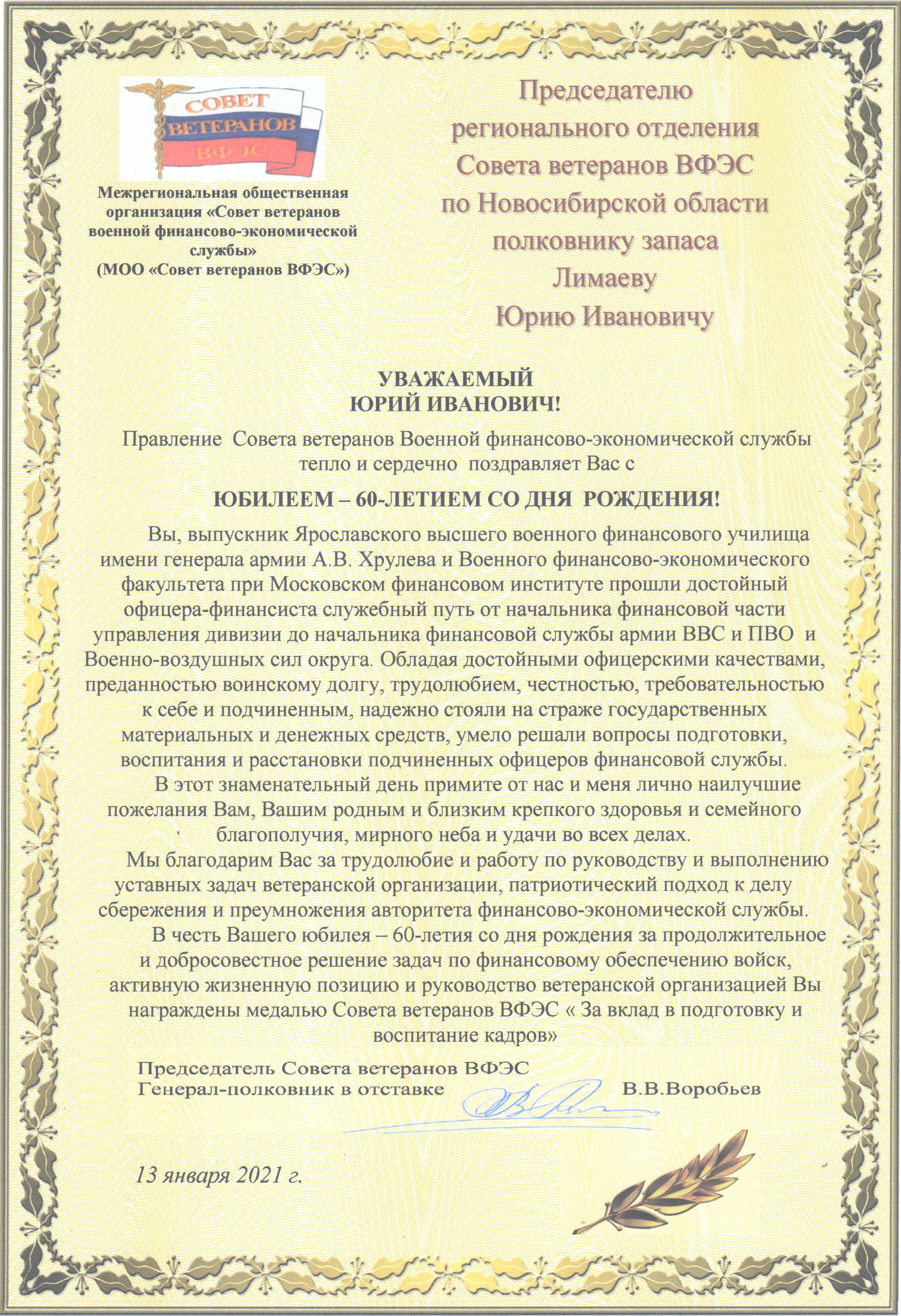 Сегодня, 22 ноября 2021 года, член регионального отделения Совета ветеранов военной финансово-экономической службы по Новосибирской области полковник запаса Я.В. Ковалев отмечает свой полувековой юбилей. Ярослав Владимирович в 1988 поступил в Ярославское высшее военное финансовое училище имени генерала армии А.В. Хрулева, после окончания которого в 1992 году был направлен в Сибирский военный округ, где проходил службу в Полевом учреждении Центрального банка Российской Федерации старшим кассиром, начальником отделений механизированного учета и вкладов, заместителем главного бухгалтера, главным бухгалтером, заместителем начальника и начальником банка. В этот период службы он в 2000 году окончил заочное отделение Военного финансово-экономического факультета при Государственной финансовой академии. С 2010 года в течение одного года служил начальником Полевого учреждения Центрального банка в г. Душанбе Республики Таджикистан, а с 2011 года по 2018 год являлся начальником полевого учреждения Центрального банка Российской Федерации в Центральном военном округе. Из 33 календарных лет службы он 28 лет проходил ее в Сибирском военном округе. На всех должностях Ярослав Владимирович добросовестно выполнял служебные обязанности, проявлял профессионализм, честность, настойчивость, трудолюбие, качественно выполнял стоящие задачи по банковскому обеспечению воинских частей, соединений и учреждений Министерства обороны Российской Федерации. Приказываю: 1. За качественное банковское обеспечение воинских частей и соединений, добросовестное выполнение служебных обязанностей и в связи с 50‑летием со дня рождения наградить полковника запаса Я.В. Ковалева медалью Совета ветеранов ВФЭС «100 лет финансово-экономической службе Вооруженных сил». 2. Поздравляя с юбилеем, желаю Вам, Ярослав Владимирович, доброго здоровья и семейного благополучия на многие годы, успехов и удачи. Председатель Совета ветеранов военной финансово-экономической службы генерал-полковник в отставке В.В. Воробьев 20 ноября 2021 г. Поздравление! 12 ноября 2021 г. Юбилей Совета ветеранов военной финансово-экономической службы 29 октября 2021 года в Центральном доме Российской Армии имени М.В. Фрунзе состоялось торжественное мероприятие, посвященное юбилею — 10‑летию со дня создания Межрегиональной общественной организации «Совет ветеранов военной финансово-экономической службы».