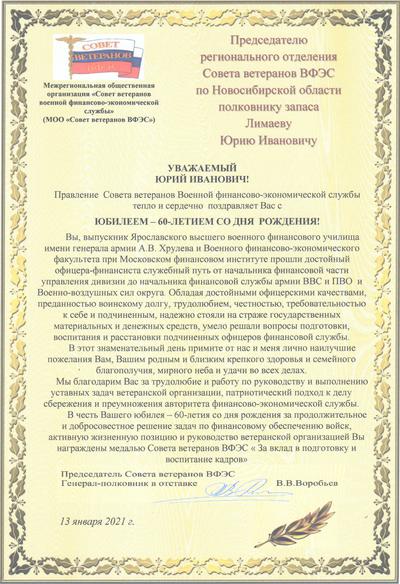 26 октября 2021 года член регионального отделения Совета ветеранов военной финансово-экономической службы по г. Санкт-Петербургу и Ленинградской области подполковник запаса С.М. Мезенцев отмечает свой юбилей, ему исполняется 60 лет. Сергей Михайлович в 1978 году поступил в Ярославское высшее военное финансовое училище имени генерала армии А.В. Хрулева, по окончании которого в 1982 году был направлен в Ленинградский военный округ, где проходил службу начальником финансовой службы отдельного батальона аэродромно-технического обеспечения авиационного полка и помощником командира отдельного батальона аэродромно-технического обеспечения вертолетного полка по финансово-экономической работе – начальником финансовой службы. С 1996 года служил заместителем начальника финансового отдела – заместителем главного бухгалтера Военной академии связи. После увольнения из Вооруженных сил в 2007 году в течение 13 лет работал в различных гражданских структурах. Общий воинский и трудовой стаж С.М. Мезенцева составляет 43 года, в том числе в Вооруженных силах 29 лет. На всех должностях Сергей Михайлович добросовестно выполнял служебные обязанности, проявлял профессионализм, честность и трудолюбие. Приказываю: 1. За многолетнее и добросовестное выполнение служебных обязанностей и в связи с юбилеем – 60‑летием со дня рождения наградить подполковника запаса С.М. Мезенцева медалью Совета ветеранов ВФЭС «За честную службу». 2. Поздравляя с юбилеем, желаю Вам, Сергей Михайлович, доброго здоровья на многие годы, бодрости духа, благополучия и удачи. Председатель Совета ветеранов военной финансово-экономической службы генерал-полковник в отставке В.В. Воробьев 22 октября 2021 г. Поздравление! 19 октября 2021 г. Поздравление! 15 октября 2021 г.