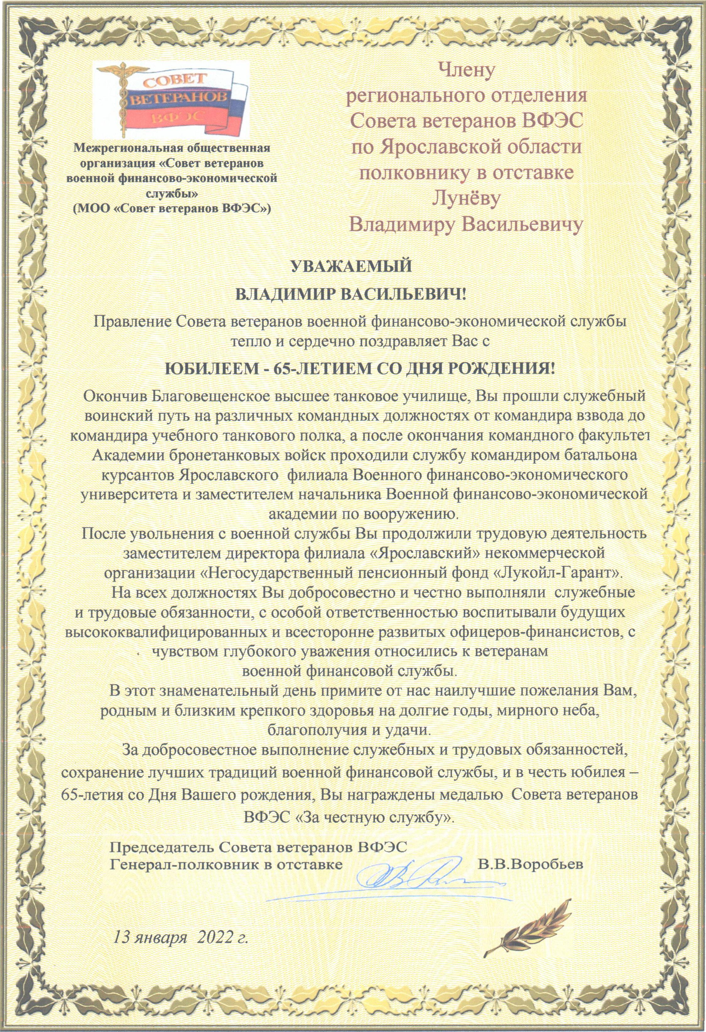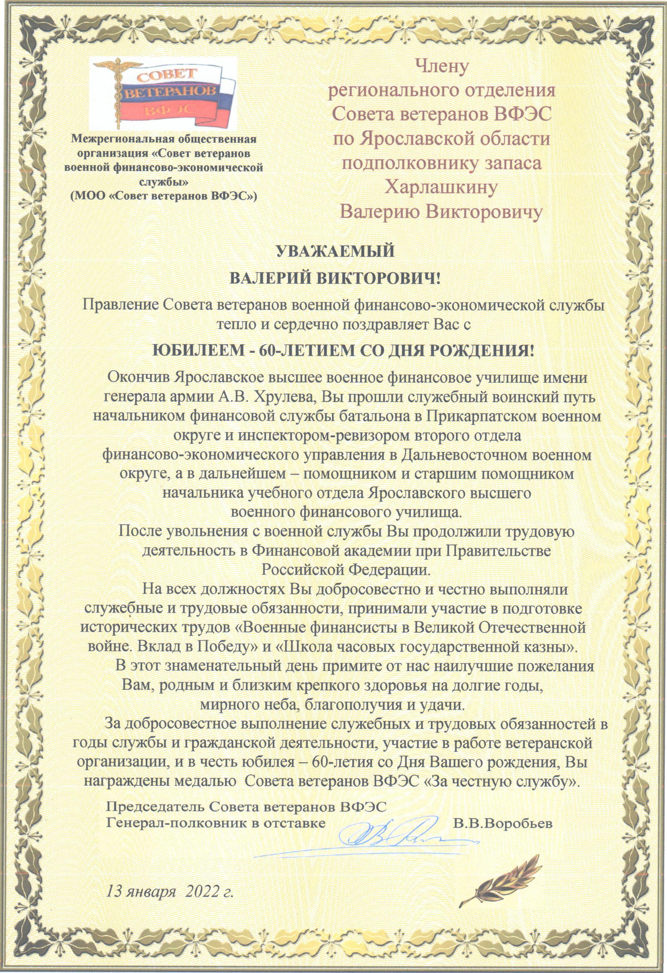 7 февраля 2022 года член регионального отделения Совета ветеранов военной финансово-экономической службы по Воронежской области подполковник запаса Г.Н. Овчинников отмечает свой юбилей, ему исполняется 60 лет. Геннадий Николаевич после окончания в 1981 году Воронежского авиационного техникума поступил в Ярославское высшее военное финансовое училище имени генерала армии А.В. Хрулева, по окончании которого в 1985 году был направлен в Дальневосточный военный округ начальником финансовой службы отдельной роты аэродромно-технического обеспечения. С 1989 года проходил службу на Тихоокеанском флоте начальником финансовой службы полка радиоэлектронной борьбы, отдела тыла флота и начальником технического отделения пункта материально-технического обеспечения. После увольнения из Вооруженных сил в 1999 году по организационно-штатным мероприятиям продолжил трудовую деятельность заместителем начальника отдела финансового контроля и надзора Территориального управления Росфиннадзора Воронежской области, а в настоящее время является старшим инспектором контрольно-ревизионной службы АО «Концерн «Созвездие». Общий воинский и трудовой стаж Г.Н. Овчинникова составляет 41 календарный год. На всех должностях Геннадий Николаевич добросовестно выполнял служебные обязанности, проявлял профессионализм, честность и трудолюбие. Приказываю: 1. За многолетнее и добросовестное выполнение служебных обязанностей и в связи с юбилеем – 60‑летием со дня рождения наградить подполковника запаса Г.Н. Овчинникова медалью Совета ветеранов ВФЭС «За честную службу». 2. Поздравляя с юбилеем, желаю Вам, Геннадий Николаевич, доброго здоровья и благополучия на многие годы, бодрости духа и удачи. Председатель Совета ветеранов военной финансово-экономической службы генерал-полковник в отставке В.В. Воробьев 6 февраля 2022 г. Поздравление! 1 февраля 2022 г. В феврале отмечают свой День рождения члены Совета ветеранов военной финансово-экономической службы: