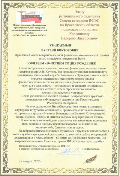 Правление Совета ветеранов горячо поздравляет коллег с этим личным праздником, желает доброго здоровья, благополучия и удачи во всех делах на благо нашего Отечества. C уважением Председатель Совета ветеранов ВФЭС генерал-полковник в отставке В.В.Воробьев 26 октября 2022 г. Уважаемые товарищи! 26 октября 2022 года ветераны и кадровые офицеры финансово-экономической службы – выпускники Ярославского высшего военного финансового училища имени генерала армии А.В. Хрулева отмечают очередную годовщину со дня его создания. Жизненный путь каждого из тысяч выпускников, обладающих чувством патриотизма, порядочностью, ответственностью, уважительным и внимательным отношением к военнослужащим, привитого им в стенах училища, является достойным примером для всех, кто посвятил себя службе Отечеству. Многие генералы и офицеры Вооруженных Сил отдают пальму первенства в вопросах личной подготовки, развития профессиональных и других качеств именно выпускникам Ярославского военного финансового училища. Совет ветеранов военной финансово-экономической службы встречает этот день с достойными результатами выполнения своих патриотических уставных задач, в решение которых вносили и вносят вклад члены ветеранской организации и прежде всего выпускники Ярославского военного финансового училища. Поздравляю вас с Днем создания Ярославского военного финансового училища, от всей души желаю вам свершения жизненных планов, доброго здоровья и благополучия на долгие годы и выражаю уверенность в том, что вы и впредь будете достойно нести звание офицера финансовой службы – выпускника родного нам училища. Председатель Совета ветеранов военной финансово-экономической службы генерал-полковник в отставке В.В. Воробьев 26 октября 2022 г. Поздравление! 24 октября 2022 г. Поздравление! 21 октября 2022 г. Поздравление! 20 октября 2022 г. 18 октября в электронном издании еженедельника «Звезда» опубликована статья «Деньги для нашей победы», подготовленная при участии члена Межрегиональной общественной организации «Совет ветеранов военной финансово-экономической службы» полковника запаса И.В. Ени. 19 октября 2022 г. Поздравление! 18 октября 2022 г. 17 октября 2022 года в Совете ветеранов военной финансово-экономической службы состоялось чествование членов Совета, активно участвующих в его работе, по случаю их юбилеев – 70-летия со дня рождения подполковника в отставке А.П. Музенко и 75-летия со дня рождения генерал-майора отставке Н.В. Гуреева и полковника в отставке П.Ф. Савинского. В ходе поздравления юбиляров В.В. Воробьев подробно рассказал о пройденном ими ратном пути, особенно в период прохождения службы в Демократической Республике Афганистан, а также трудовой деятельности после увольнения с военной службы, их вкладе в финансовое и материальное обеспечение воинских частей и соединений, социальное обеспечение личного состава, а также подготовку и воспитание офицерских кадров. Особенно были отмечены их высокие морально-боевые и человеческие качества, профессионализм, мужество, большое трудолюбие, честность и ответственность, активное участие в работе ветеранской организации, за что они по праву заслужили глубокое уважение сослуживцев, старших и младших по службе и всех членов ветеранской организации. Председатель Совета зачитал приказы о награждении юбиляров и в зна