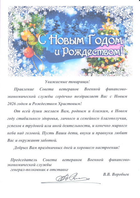 Правление Совета ветеранов горячо поздравляет коллег с этим личным праздником, желает доброго здоровья, благополучия и удачи во всех делах на благо нашего Отечества. C уважением Председатель Совета ветеранов ВФЭС генерал-полковник в отставке В.В.Воробьев 29 ноября 2025 г.
