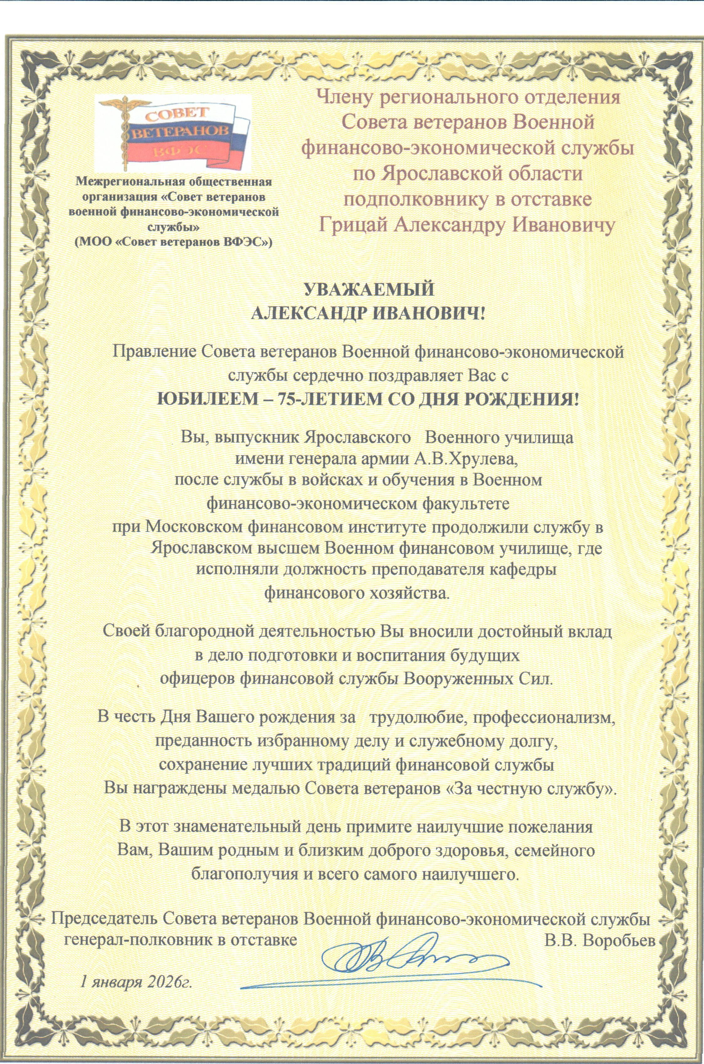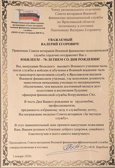 Сегодня, 1 января 2026 года, член регионального Совета ветеранов военной финансово-экономической службы по Свердловской области полковник в отставке Н.А. Гладышев празднует свой юбилей, ему исполняется 75 лет. Николай Александрович в 1972 году окончил 331 школу прапорщиков при Ярославском военном училище, в 1976 году заочно окончил Омский финансово-кредитный техникум и в 1980 году сдал экзамены экстерном за полный курс Ярославского военного финансового училища имени генерала армии А.В. Хрулева. Значительную часть своей военной службы прошел на финансовых должностях в железнодорожных войсках Министерства обороны и закончил ее в 2001 году помощником командира 4‑го железнодорожного корпуса по финансово-экономической работе – главным бухгалтером. Выслуга лет в Вооруженных силах РФ составляет более 31 года. За годы службы Николай Александрович проявил себя активным, принципиальным, трудолюбивым офицером. Пользовался заслуженным авторитетом в коллективе среди подчиненных и старших начальников. Приказываю: 1. За достойную воинскую службу и трудовую деятельность, личный вклад в финансовое обеспечение железнодорожных войск Министерства обороны, их развитие, совершенствование и в связи c 75‑летием со дня рождения наградить полковника в отставке Н.А. Гладышева медалью Совета ветеранов «За честную службу» 2. Желаю Вам, Николай Александрович, крепкого здоровья, благополучия, удачи и мирного неба. Председатель Совета ветеранов военной финансово-экономической службы генерал-полковник в отставке В.В. Воробьев 1 января 2026 г. Поздравление! 1 января 2026 г. Поздравление! 1 января 2026 г.