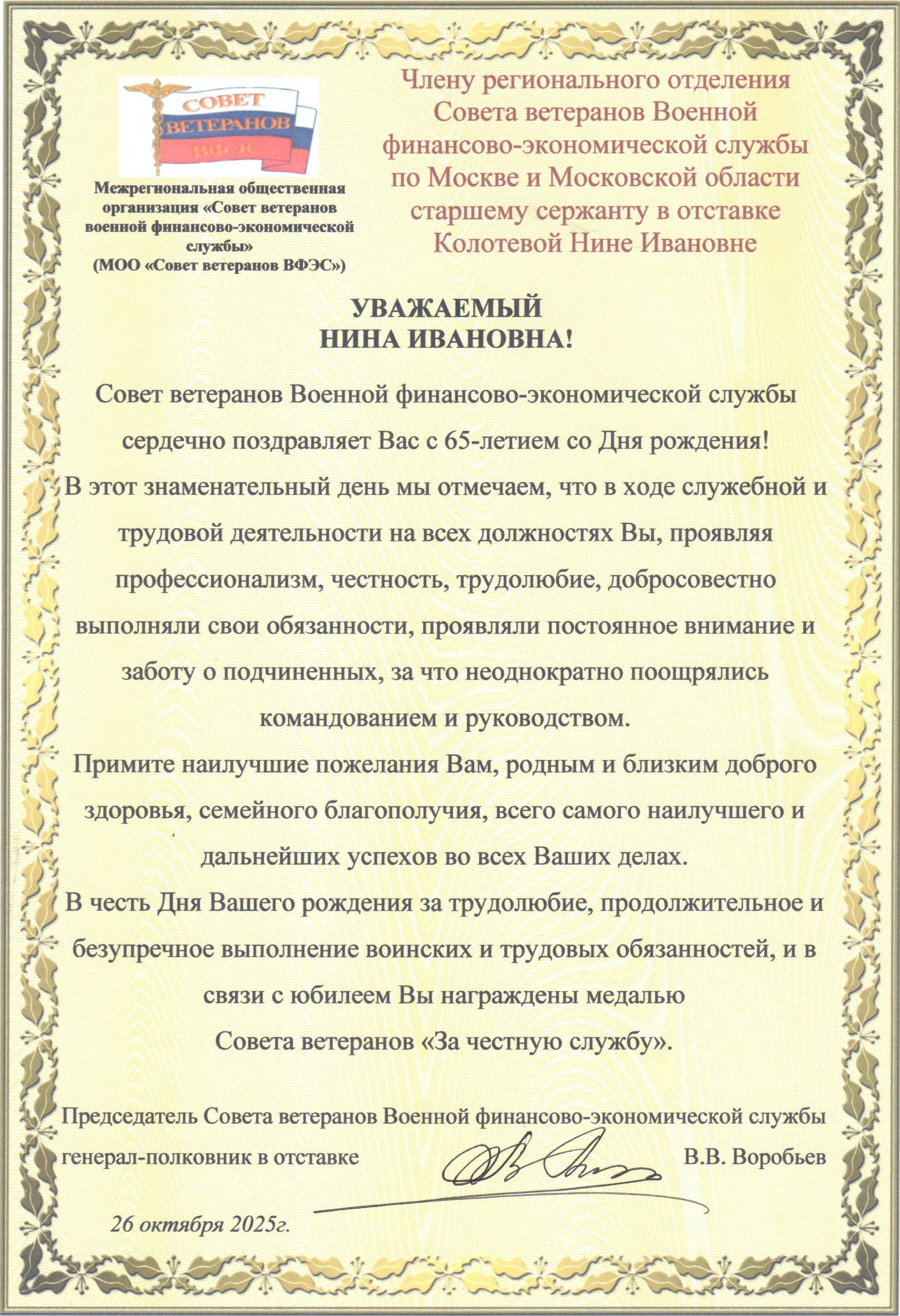 Сегодня, 7 ноября 2025 года, член регионального отделения Совета ветеранов Военной финансово-экономической службы по Новосибирской области старший прапорщик в отставке О.И. Воробьева празднует юбилей, ей исполняется 65 лет. Ольга Игоревна окончила в 1985 году Новосибирский институт народного хозяйства, а в 1989 году добровольно поступила на военную службу в Сибирский военный округ, где до декабря 2006 года служила в воинских частях на должностях тылового обеспечения. С 2006 года в течение 7 лет проходила службу в воинских частях этого же военного округа на должностях помощника командира по финансово-экономической работе отдельного батальона и заместителя начальника финансовой службы полка. После увольнения из Вооруженных сил в 2013 году она продолжила работу на финансовых должностях в ФКУ «Управление финансового обеспечения Министерства обороны РФ по Новосибирской области» 54 финансово-экономической службы МО РФ, где работает по настоящее время. Ее общий воинский и трудовой стаж составляет 36 лет. На всех должностях Ольга Игоревна добросовестно выполняла служебные обязанности, проявляла профессионализм, честность и трудолюбие. Приказываю: 1. 3а добросовестное исполнение воинских служебных и трудовых обязанностей и в связи с юбилеем – 65‑летием со дня рождения наградить старшего прапорщика в отставке О.И. Воробьеву медалью Совета ветеранов ВФЭС «За честную службу». 2. Желаю Вам, Ольга Игоревна, доброго здоровья на многие годы, бодрости духа, благополучия и успехов. Председатель Совета ветеранов военной финансово-экономической службы генерал-полковник в отставке В.В. Воробьев 4 ноября 2025 г.