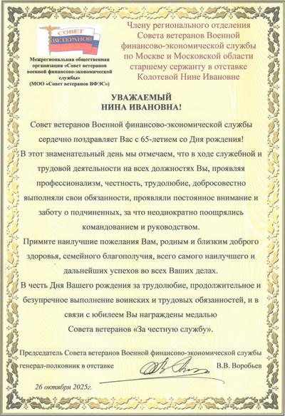 4 октября 2025 г. Поздравление! 1 октября 2025 г. В октябре отмечают свой День рождения члены Совета ветеранов военной финансово-экономической службы: