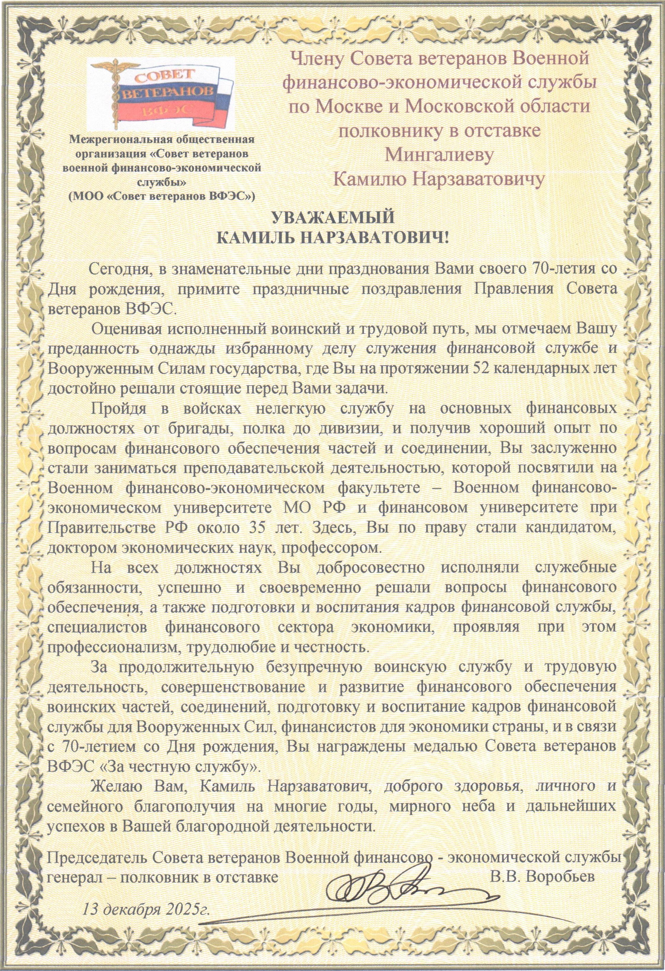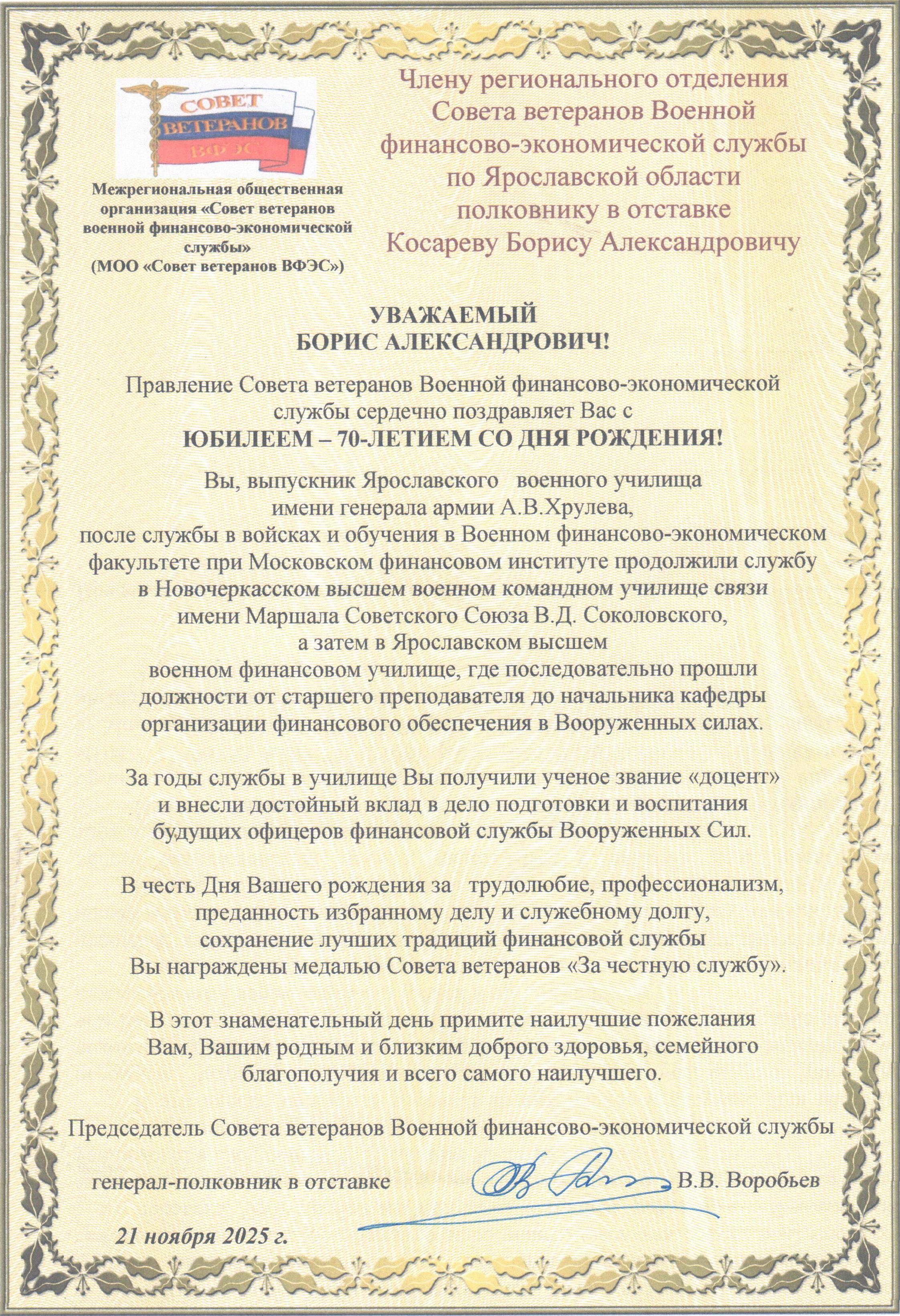 Сегодня, 31 октября 2025 года, член регионального отделения Совета ветеранов Военной финансово-экономической службы по Нижегородской области подполковник в отставке Н.А. Зайцев отмечает свой юбилей. Ему исполняется 70 лет. Николай Александрович в 1974 году поступил в Ярославское высшее военное финансовое училище имени генерала армии А.В. Хрулева, после окончания которого в 1978 году направлен в Дальневосточный военный округ начальником финансовой службы батальона. В 1980 году он был там же назначен на должность начальника финансовой службы полка, а в 1982 году – инспектором-ревизором финансовой службы 270 МСД 15 ОА. В 1987 году после окончания Военного финансово-экономического факультета при МФИ он возглавил финансовую службу армейского корпуса в Московском военном округе, а в последующем, после его развертывания в общевойсковую армию, назначен в ней инспектором-ревизором финансовой службы. С 1992 года по день увольнения в 2003 году проходил службу в Нижегородском высшем военно–инженерном командном училище на должности помощника начальника училища по финансово-экономической работе – начальника финансового отдела. После окончания военной службы с ноября 2003 года по март 2013 года работал на различных должностях в финансовом отделе училища. На всех должностях он добросовестно выполнял служебные обязанности, проявлял честность, трудолюбие и профессионализм, за что награжден многими ведомственными наградами. Приказываю: 1. За достойное исполнение воинских служебных и трудовых задач, личный вклад в обеспечение сохранности государственных материальных и денежных средств и в связи с юбилеем наградить подполковника в отставке Н.А. Зайцева медалью Совета ветеранов «За честную службу». 2. Поздравляя с юбилеем, желаем вам, Николай Александрович, доброго здоровья на многие годы, бодрости духа и семейного благополучия. Председатель Совета ветеранов военной финансово-экономической службы генерал-полковник в отставке В.В. Воробьев 31 октября 2025 г.