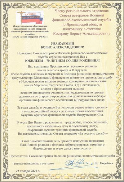 Сегодня, 8 августа 2025 года, член регионального отделения Совета ветеранов Военной финансово-экономической службы по Ярославской области подполковник в отставке А.Н. Кузьмин празднует день рождения. Ему исполняется 70 лет. Александр Николаевич в 1972 году поступил, а в 1975 закончил Ярославское высшее военное финансовое ордена Красной Звезды училище имени генерала армии А.В. Хрулева. После окончания училища с 1975 по 1983 год проходил военную службу в Дальневосточном военном округе в должности начальника финансовой службы отдельного пулеметно-артиллерийского батальона, мотострелкового полка, инспектора-ревизора финансовой службы мотострелковой дивизии. С 1983 по 1986 год являлся слушателем Военного финансово-экономического факультета при Московском финансовом институте, а с 1986 по 1990 год руководил финансовой службой мотострелковой дивизии в Южной группе войск, откуда после замены продолжил службу на аналогичной должности в Киевском и Одесском военных округах в течении двух лет. С 1993 по 2002 год был преподавателем кафедры финансового обеспечения воинской части в Ярославском высшем военном финансовом ордена Красной Звезды училище имени генерала армии А.В. Хрулева. После увольнения в 2002 году из Вооруженных сил продолжил трудовую деятельность на Ярославском шинном заводе в должности начальника контрольно-ревизионной группы, а затем с 2005 по 2007 год работал начальником отдела заказов и реализации продукции на 132 военном заводе. С 2007 по 2014 год трудился начальником административно-хозяйственного отделения АО «Ярполимер». С 2014 года по настоящее время возглавляет отдел охраны труда, промышленной, пожарной безопасности, гражданской обороны, защиты от чрезвычайных ситуаций, экологической безопасности и рационального природопользования АО «Стальмост». Александра Николаевича всегда отличали преданность воинскому долгу, принципиальность, трудолюбие и скромность, высокое профессиональное мастерство, за что он пользуется заслуженным авторитетом в коллективе. Его общий воинский и трудовой стаж составляет 53 года, из которых 30 лет отдано служению Отечеству. Приказываю: 1. 3а достойную воинскую службу и трудовую деятельность, личный вклад в обеспечение боевой и мобилизационной готовности частей и соединений Вооруженных сил, профессиональную подготовку военных финансистов, развитие и сохранение лучших традиций военной финансово-экономической службы и в связи с 70‑летием со дня рождения, наградить подполковника в отставке А.Н. Кузьмина медалью Совета ветеранов ВФЭС «За вклад в подготовку и воспитание кадров». 2. Желаю Вам, Александр Николаевич, доброго здоровья на многие годы, исполнения всего задуманного, бодрости духа, благополучия и удачи. Председатель Совета ветеранов военной финансово-экономической службы генерал-полковник в отставке В.В. Воробьев 2 августа 2025 г. 28 июля с.г. председатель Совета ветеранов военной финансово-экономической службы генерал-полковник в отставке В.В. Воробьев по приглашению президента Международной общественной организации бывших военнослужащих «Марс-Меркурий» посетил эту организацию и поздравил ее членов с Днем Военно-Морского флота. Общественная организация «Марс-Меркурий» создана в 1992 году офицерами запаса Главного штаба и Политуправления Военно-морского флота. Она имеет статус международной, т.к