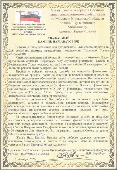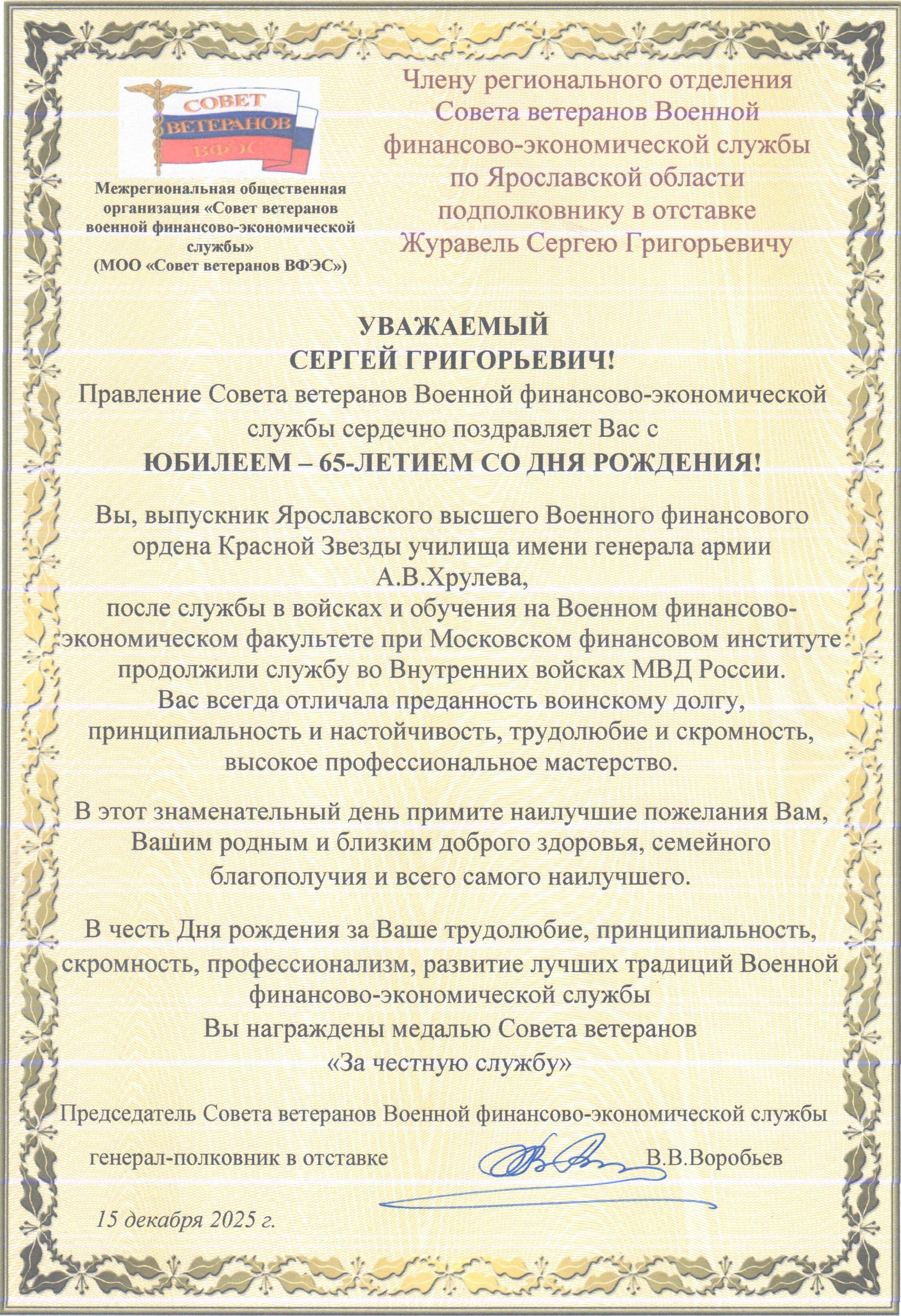 16 декабря 2025 года член регионального отделения Совета ветеранов Военной финансово-экономической службы по Ростовской области полковник в отставке В.П. Строков отмечает свое семидесятилетние. Виктор Павлович в 1978 году окончил Ярославское высшее военное финансовое училище им. генерала армии А.В. Хрулева и после семи лет службы в Дальневосточном военном округе на должностях начальника финансового довольствия батальона и полка в течении трех лет обучался на Военном финансово-экономическом факультете при МФИ, а с 1987 по 1990 год являлся начальником финансовой службы бригады материального обеспечения и старшим инспектором-ревизором финансовой службы общевойсковой армии группы Советских войск в Германии. В дальнейшем там же, в ГСВГ, исполнял должности начальника финансовой службы мотострелковой дивизии и начальника финансового отделения медицинской службы группы войск. С 1992 по 1993 год проходил службу инспектором-ревизором инспекции финансовой службы Северо-Кавказского военного округа. С 1993 по 2005 год там же в финансово-экономическом управлении округа проходил службу на различных должностях от старшего офицера до начальника отдела организационно-планового и денежного довольствия – заместителя начальника управления. Принимал участие в Осетино-Ингушском конфликте и контртеррористической операции на территории Северо-Кавказского региона. Уволен в запас в 2005 году. На всех должностях Виктор Павлович добросовестно исполнял свои служебные и трудовые обязанности, проявлял высокий профессионализм, честность и трудолюбие. Приказываю: 1. За достойную воинскую службу, качественное решение задач финансового обеспечения боевой, мобилизационной готовности частей, учреждений, соединений и объединений Вооруженных сил, организацию, осуществление финансового контроля за использованием материальных, денежных средств, социальной защиты военнослужащих и членов их семей и в связи с 70‑летием со дня рождения, наградить полковника в отставке В.П. Строкова орденом Совета ветеранов ВФЭС «За личный вклад в совершенствование и развитие финансовой службы Вооруженных сил». 2. Поздравляя с Днем рождения, желаю Вам, Виктор Павлович, доброго здоровья, благополучия, успехов и удачи во всех делах. Председатель Совета ветеранов военной финансово-экономической службы генерал-полковник в отставке В.В. Воробьев 15 декабря 2025 г. Поздравление! 13 декабря 2025 г. Поздравление! 10 декабря 2025 г.